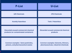 Some chemicals are individually listed as hazardous when they are present in their pure form or as the sole active ingredient. These are listed on what’s called the P-List and U-List, and the rules apply specifically to the chemicals in their pure, unused form. Once the chemicals are used, they no longer fall under these lists. However, there’s an important detail: the empty containers that held P-List or U-List chemicals—and even the rinse water used to clean those containers—are still regulated as hazardous waste under these same lists.